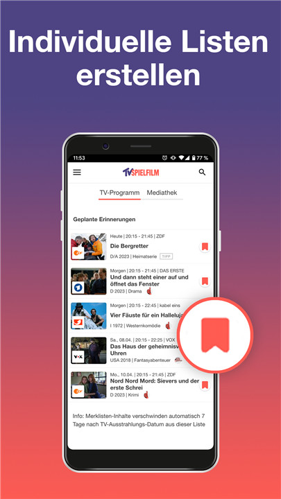 • If you’d like to use the app without ads, opt for the “Ad-free” option in the app menu by purchasing the "TV SPIELFILM ad-free" feature for just EUR 0.89 per month.