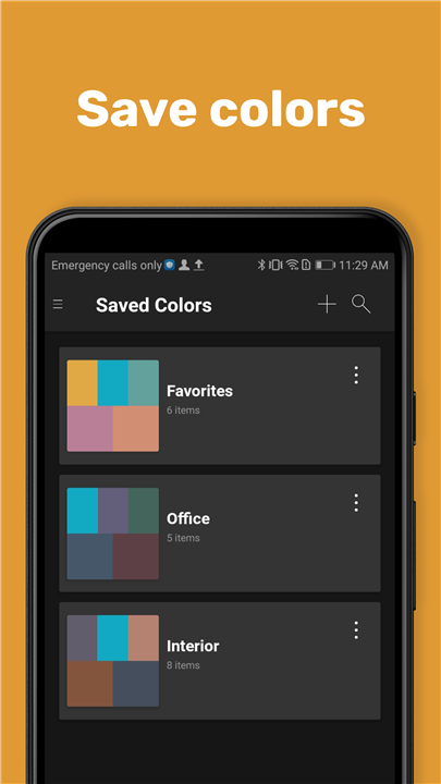 - Create custom projects and folders, add notes, save and organize palettes, and easily share your color selections via email or text.