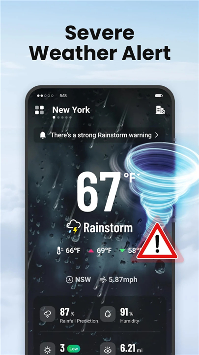 • Instant notifications for extreme conditions such as high heat, heavy rain, thunderstorms, snowstorms, blizzards, floods, and more.
