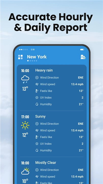 A: Absolutely. You can view a detailed hourly breakdown showing temperature fluctuations, wind changes, and the likelihood of precipitation throughout the day. For a broader view, the daily forecast highlights high and low temperatures, sunrise and sunset times, humidity levels, and more, all in one intuitive screen.