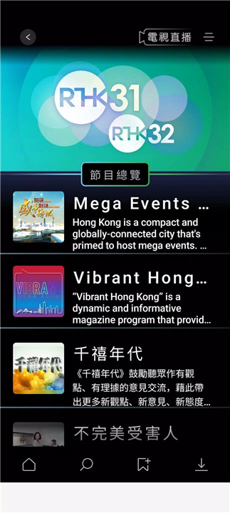 RTHK電視,你可以在此观看港台电视节目的在线直播、点播以及下载服务,让你绝对能第一时间收看到最新的电视节目。除此之外,我们还特别设置了定制功能,让你根据自己的喜好,轻松制定出个性化的播放列表,便捷地观看自己钟爱的节目。