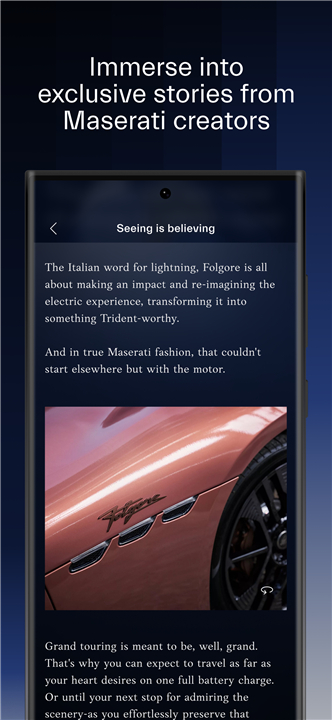 A: Through the app, you can discover the origins of the legendary Trident emblem, learn about Maserati’s century-long pursuit of excellence, and explore milestones that define its identity as a global leader in performance, craftsmanship, and design. It’s like having Maserati’s story right in your pocket.