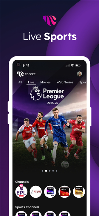 • Toffee is your one-stop streaming platform that brings together live sports, TV channels, exclusive web series, movies, dramas, and music videos.