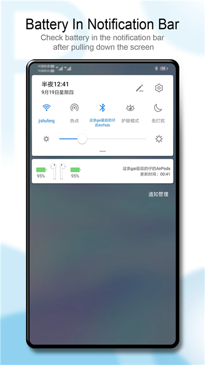 A: When you connect your AirPods or Beats to your Android device, PodsBattery automatically displays a simple pop-up window with the battery information. You can also see battery levels in your notification bar, status bar, home screen widgets, and even in the quick settings panel for easy access.