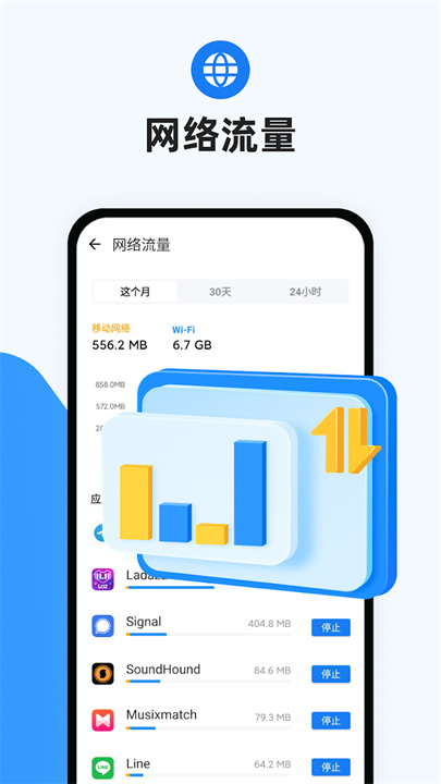 流量统计:分析移动数据和 Wi-Fi 使用情况,帮助您合理控制数据消耗。