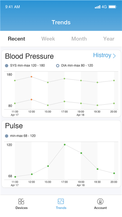 • Easy-to-read graphs and charts display measurement trends over days, weeks, or months.