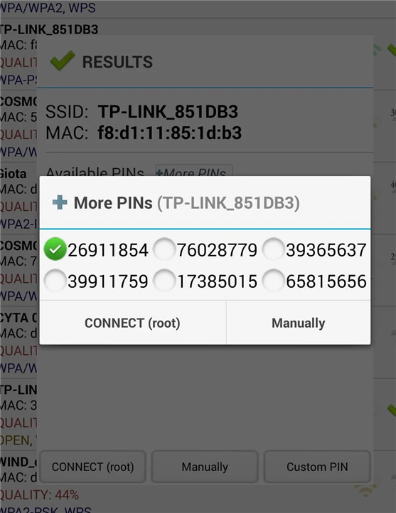 • Network Connection: Enables connection to Wi-Fi networks with active WPS protocol, provided the correct PIN is obtained.