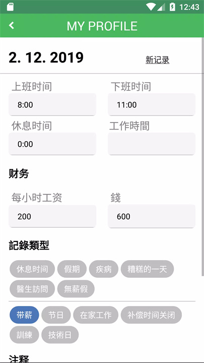 是的,应用可以记录您的工作时数并根据设置计算收入。