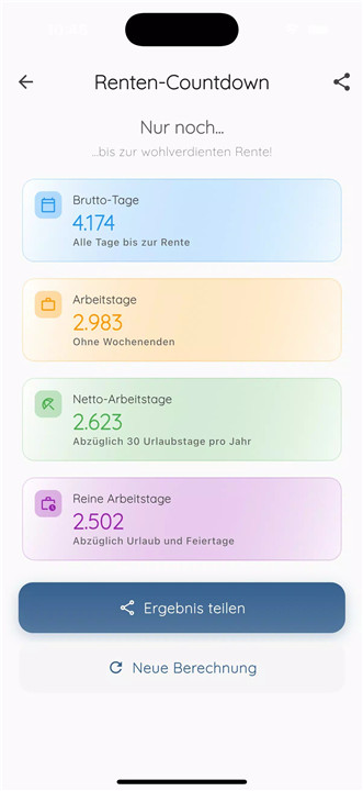 While most retirement countdown tools include weekends and holidays, Retirement Countdown cuts through the fluff. This app only counts your real working days. That means weekends, vacation days, and public holidays are excluded from the countdown. What you’re left with is the actual time you’re spending in the office—no distractions, no padding, just the pure truth.
