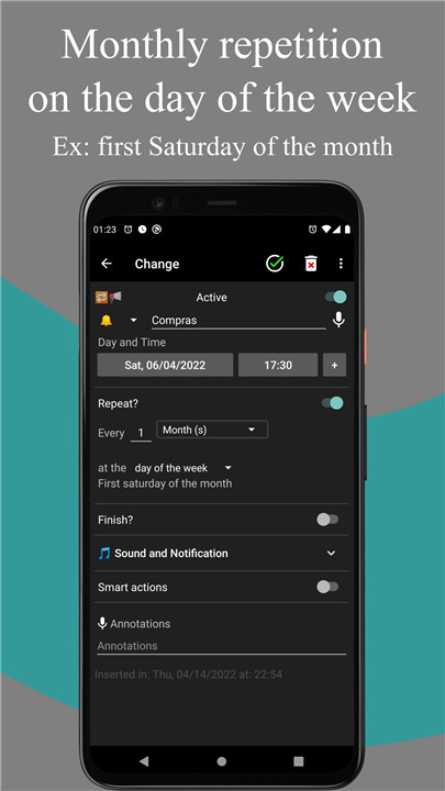 The app offers the flexibility to set multiple executions for a single alarm, allowing users to create diverse repetition schedules. For example, alarms can be programmed to ring on certain days each month or to repeat daily at different times, such as after meals.