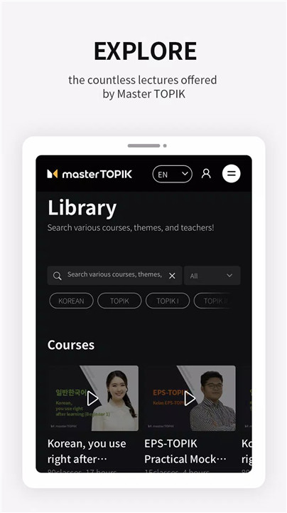 masterTOPIK is the premier e-learning website designed to help you achieve your target TOPIK (Test of Proficiency in Korean) score in the fastest and easiest way possible. With comprehensive courses, personalized curriculum recommendations, and state-of-the-art features, masterTOPIK is your best partner in mastering the Korean language.