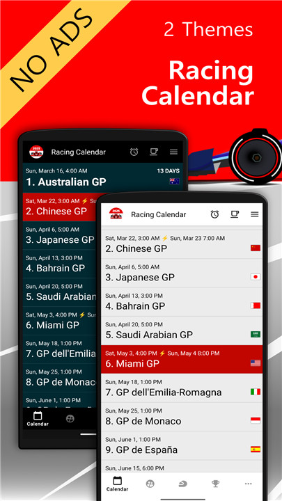 Racing Calendar 2025 is your ultimate guide to the thrilling world of Formula 1™. This app provides a complete overview of all F1™ races scheduled for the year 2025, including crucial details about teams, (test) drivers, tyres, and the current standings in the World Championship.