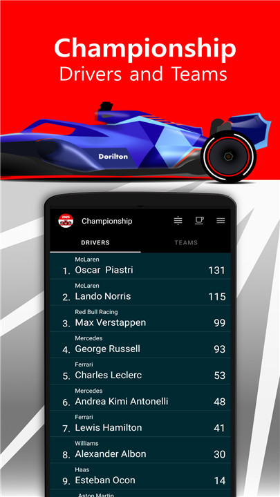 F1™ 2025 standing, races, teams, drivers. Full version without any ads Download the latest version of Racing Calendar 2025 + Ranking to enjoy new features and updates immediately!