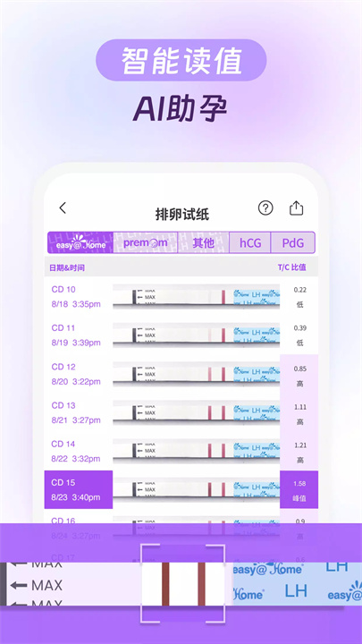 Premom还提供排卵和验孕棒的拍照识别功能,用户可以直接上传排卵试纸的照片,应用会快速读取数值,并以高峰值、低峰值等标识易孕几率。