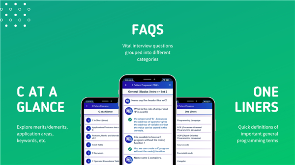 A: Pattern programs hone your logic and loop-handling skills by guiding you through visual outputs like pyramids, waves, and ASCII art. Practicing these exercises helps you sharpen problem-solving techniques commonly tested in coding interviews. C Pattern Programs also includes a dedicated FAQ section with categorized interview questions and answer keys, allowing you to identify weaknesses in your approach, review explanations, and build confidence for real-world placements.