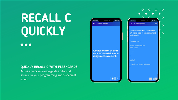 • Recall C - Flashcards - No more lengthy or mismanaged stuff, just to the point C programming feeds with proper explanation to revise quickly.