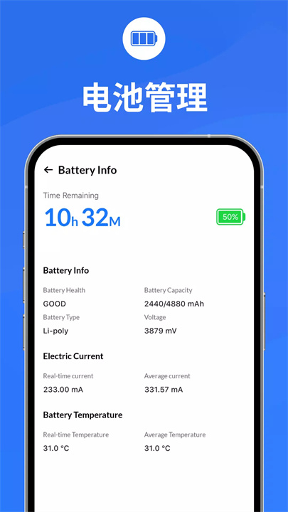 打开应用后,进入“电池信息”功能,系统会显示剩余使用时间和充满电的预计时间。