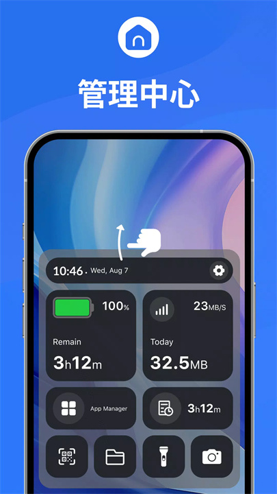 向上滑动进入“管理中心”,可以快速访问电池、存储、应用管理等常用功能。