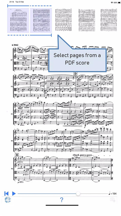 Rearrange, crop, mask pages, and select page ranges in PDFs. Search and sort your scores by title or composer to stay organized.