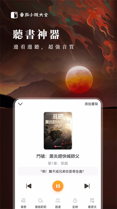 同时支持小说听书功能,选择不同的主播声音,既能看又能听,完美结合视觉与听觉。