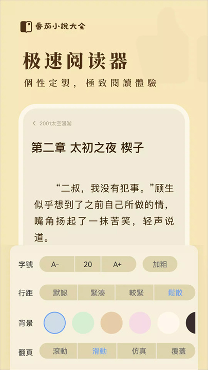 自定义阅读背景、字体、字号,夜间模式与护眼模式保护您的眼睛,尽享舒适阅读体验。