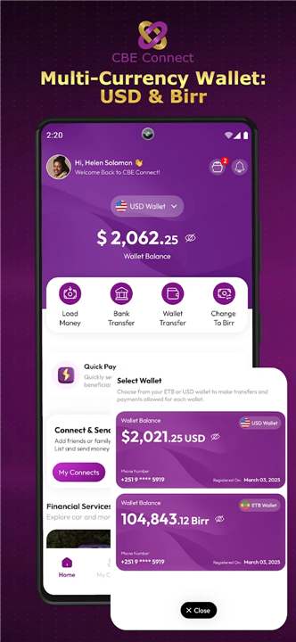 • Multi-Currency Support: Manage ETB and USD wallets in one convenient app without the need for multiple accounts.