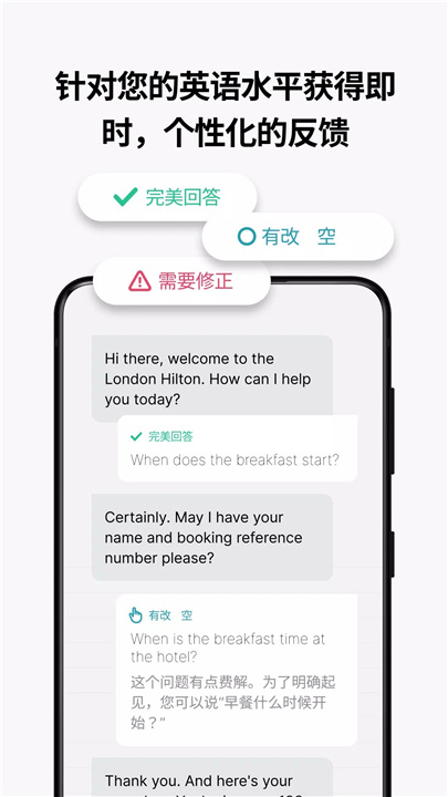 Speak下载的学习秘诀在于:“说得越多,学得越快”。自信地开口说英文,是快速提高语言水平的关键。我们平台为您提供的,是最顶尖的英文专家,随时待命为您服务。专属于您的纯正英文语言大师,24小时无缝陪伴,助您时时刻刻精炼英语技巧,逐步提高语言运用能力。我们拥有强大无比的专业技术支持,必将让您在英语学习的道路上获得前所未有的震撼体验!