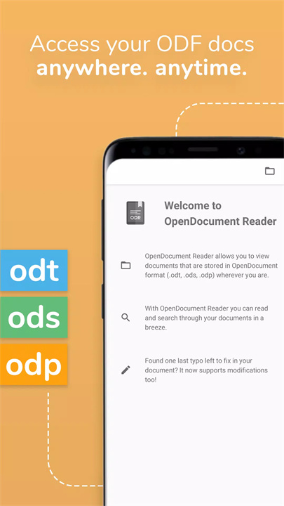 OpenDocument 阅读器可以让您随时查看文档。应用不仅支持快速打开并阅读文档内容,还提供基本的编辑功能,用户可以修正拼写错误、添加段落等操作。用户无需连接互联网即可使用此应用,完全离线也能访问和编辑已存储的文档。