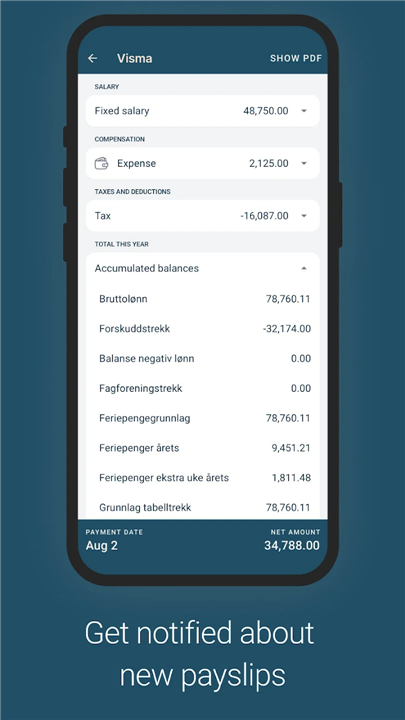 • Visma Employee ensures your financial information is always within reach, offering unparalleled access and insight into your earnings: