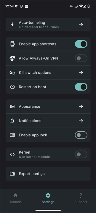 Users can export their Amnezia and WireGuard tunnel configurations as ZIP files. This feature is useful for backing up settings or sharing configurations with others.