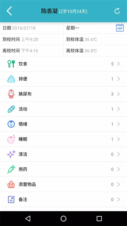 老师可以在应用中快速输入孩子的到校时间、体温、饮食、睡眠、排便等数据,界面简洁易用。