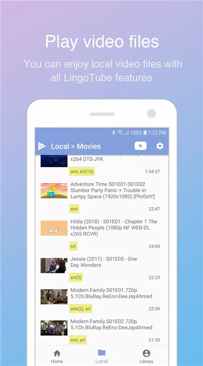 您可以尽情畅享LingoTube极其多元的功能与语言学习资源,无缝切换于娱乐与学习之间。透过视频快乐学语言,学习变得更简单、更愉悦!此外,LingoTube app还支持视频文件的播放,并兼容SRT、SMI格式的字幕文件。