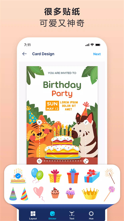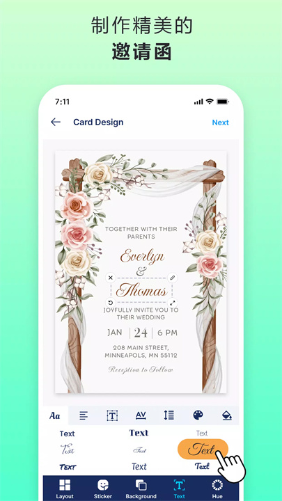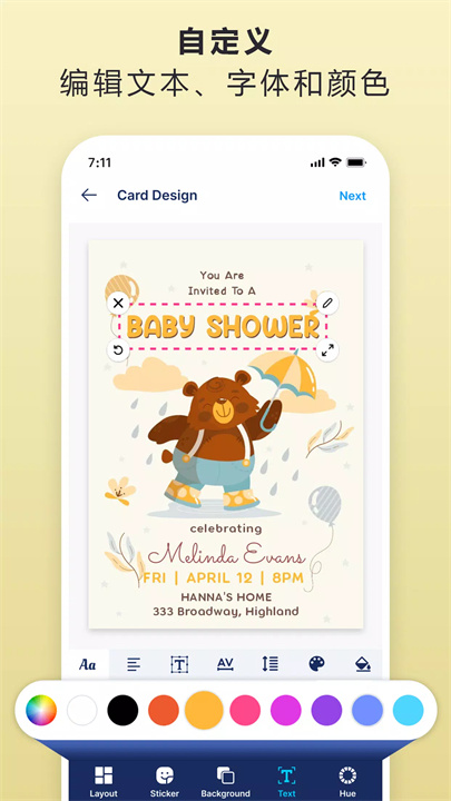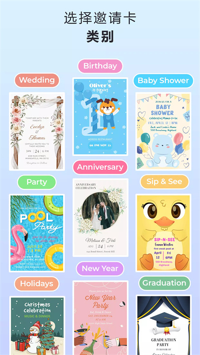 应用内提供各种精美的模板,满足各种场合的需求,如婚礼邀请函、生日贺卡、派对邀请、婴儿送礼会等。您可以根据活动类型选择合适的模板,快速开始设计。