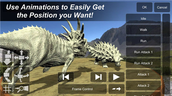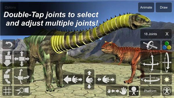 Adjust each dinosaur's body parts with precision. By double-clicking a joint, users can select multiple joints, enabling intricate posing adjustments. The app also allows for simultaneous adjustments of multiple mannequins in the same scene, perfect for creating dynamic interactions between dinosaurs.