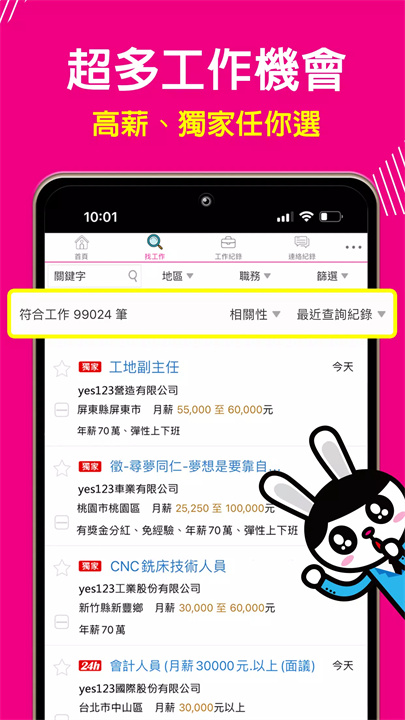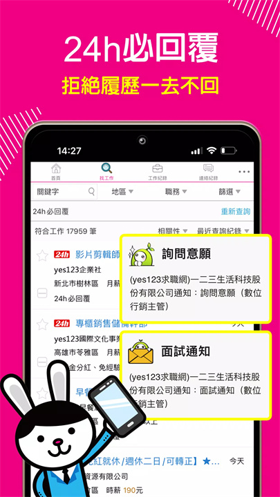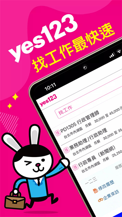 [yes123找工作]是一个帮助大家快速找到工作的应用,提供30万以上的职位信息,涵盖正职、兼职和工读工作。通过AI优化履历、性格测试等功能,帮助你找到最适合的职位。你还可以直接与企业联系,省去中介环节。会员可以通过签到和投递简历获得奖励,工作机会触手可及。工作这么多,怎么选?yes123,帮你挑到最合适的!