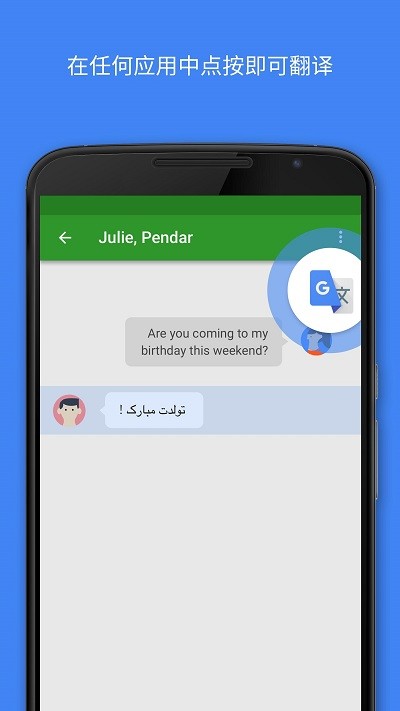 凭借点按翻译(Tap to translate)功能,用户可在其他 Android App 上直接使用谷歌翻译而无需切换界面。该功能被启用后,可在任意 App 中选中并复制需要翻译的文字内容 (如聊天记录、评论、歌词等),谷歌翻译的按钮便会自动出现在当前界面,点击即可获取翻译结果;