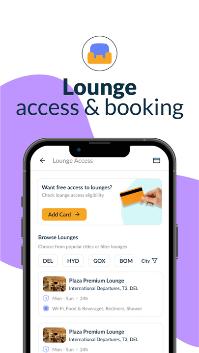 • Reserve your place in premium airport lounges to enjoy quietude, refreshments, and high-speed connectivity.
