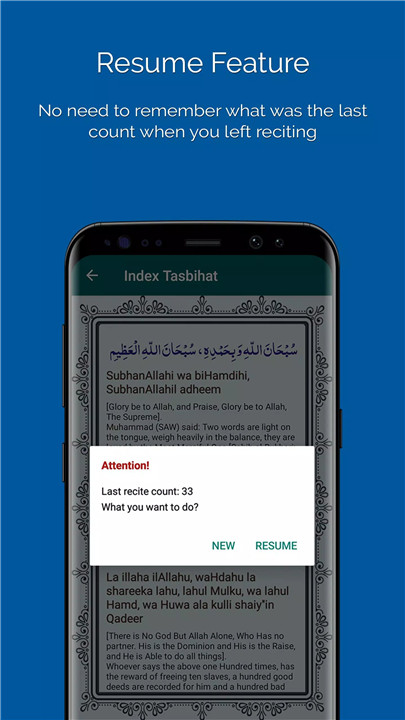The app features a Save Your Progress function, enabling you to store your current tasbih count and resume later. Additionally, the My Statistics section allows you to track your daily progress and recitation history.