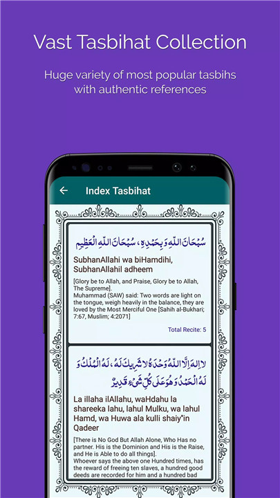 The app offers an extensive library of tasbihs derived from authentic Quranic and Hadith references. Each tasbih is accompanied by translations and transliterations, making it easier to understand and recite. With just a single tap, you can select and begin your recitation, providing an easy and accessible way to engage with the praises of Allah.