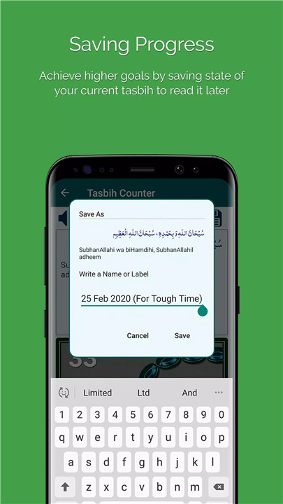 Tasbih offers the unique ability to save your progress for future reflection. By tapping the Save icon, you can store your recitation progress, allowing you to pick up where you left off whenever you return to the app.
