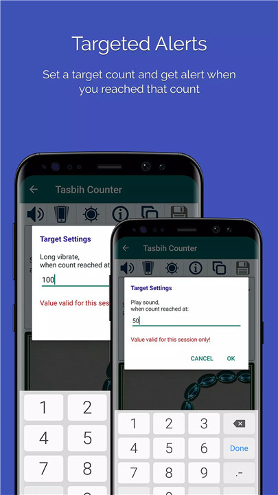 With Targeted Alerts, you can set a specific count goal for your recitations. The app will notify you with a distinct sound and vibration when you reach your set target, helping you maintain focus and consistency in your Zikr routine.