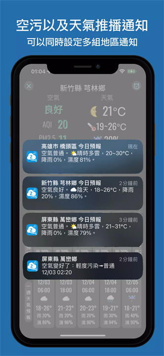 可设定关注站点,当空气从良好变糟或由污染改善时,及时收到推播通知。