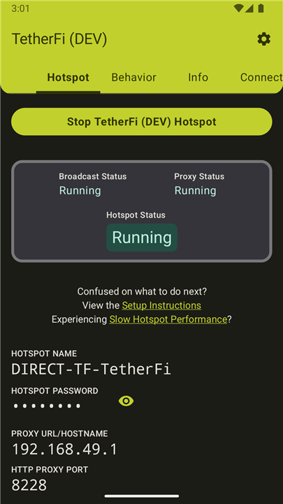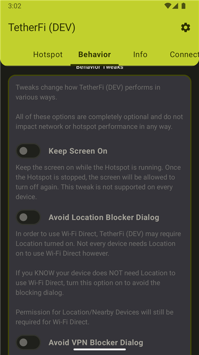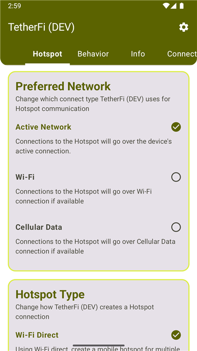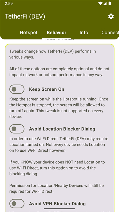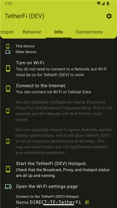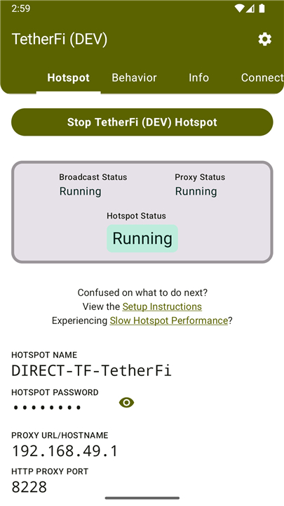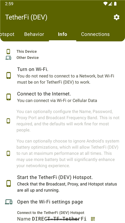 • TetherFi operates through a Foreground Service, allowing it to maintain a stable and continuous Wi-Fi Direct network.