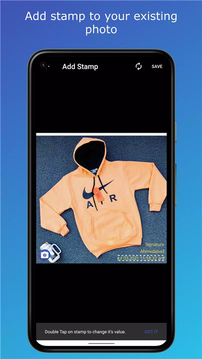 Add your logo as a signature to make your photos uniquely yours. Additionally, you can insert custom text as a signature stamp for even more personalization.