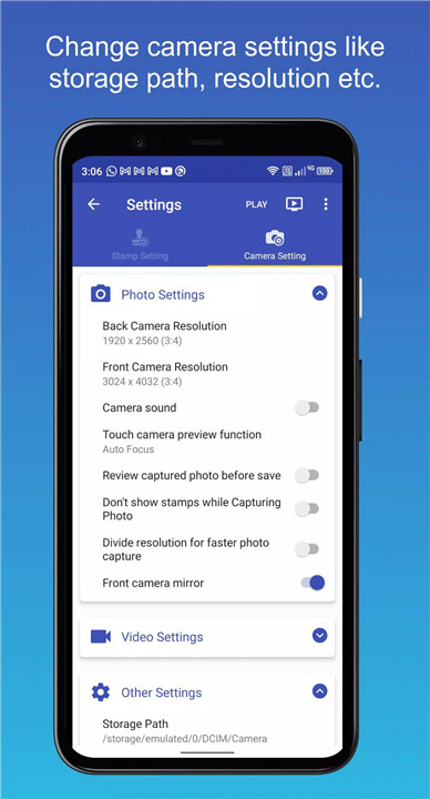 Set your camera resolution according to your needs, with support for all aspect ratios and resolutions. You can also change the storage location for your photos, ensuring easy organization.