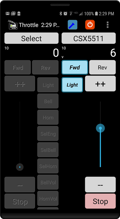 A: You can control up to six locomotives or consists simultaneously. Each locomotive appears as a separate slot on your screen, allowing you to switch between engines, control their speed and direction, and activate functions without having to re-address the throttle each time.