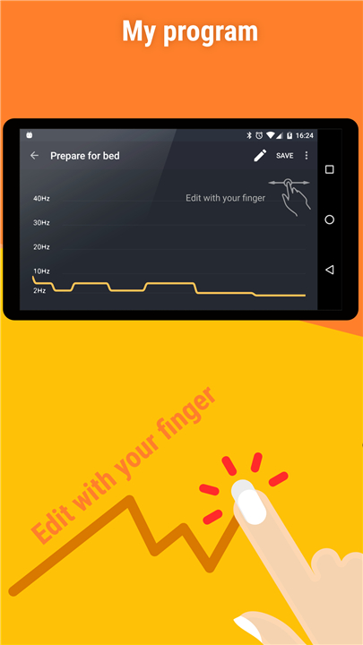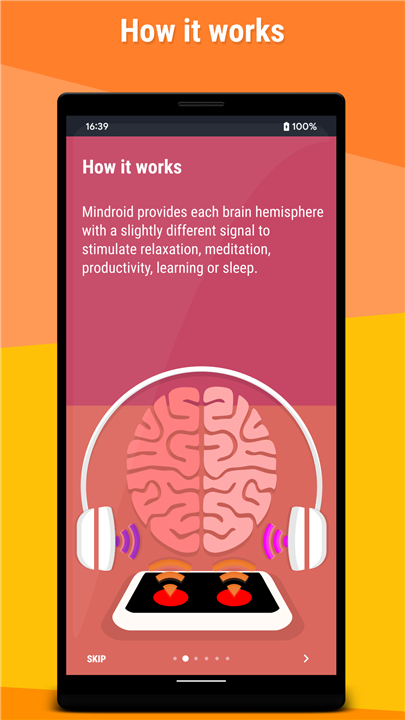 • The app stimulates your brain waves by transmitting signals (either auditory or visual) at slightly different frequencies to each hemisphere of your brain.