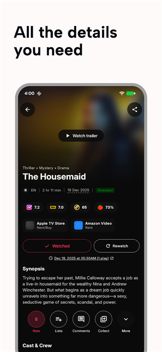 • Access deep insights, including high-quality trailers, cast details, and comprehensive community reviews from IMDb and TMDb.
