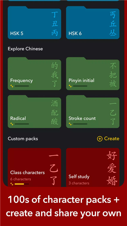 Whether you're a beginner or an experienced learner, Chinese Writer is suitable for everyone. Characters are divided into packs by difficulty according to the official HSK standard, making it easy to find content suitable for your level. You can even create your own packs by searching for characters by Pinyin, English, or Chinese characters.