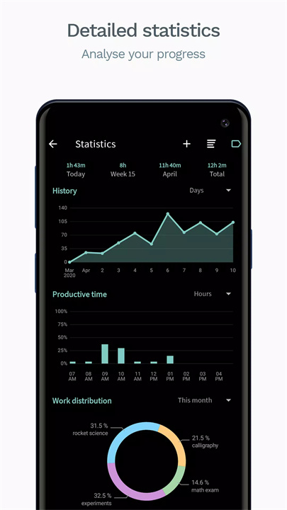 Goodtime提供详细的工作统计数据,帮助用户清楚了解自己的工作习惯、效率和休息情况,进一步优化时间管理。